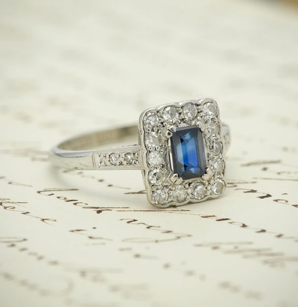 A stunning Art Deco sapphire and diamond cluster ring, dating to the glamorous 1930's, featuring a rectangular cut sapphire of a deep sea blue - the linear facets evoking sleek sophistication, synonymous with the Art Deco movement.