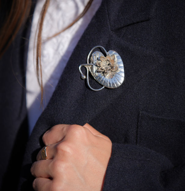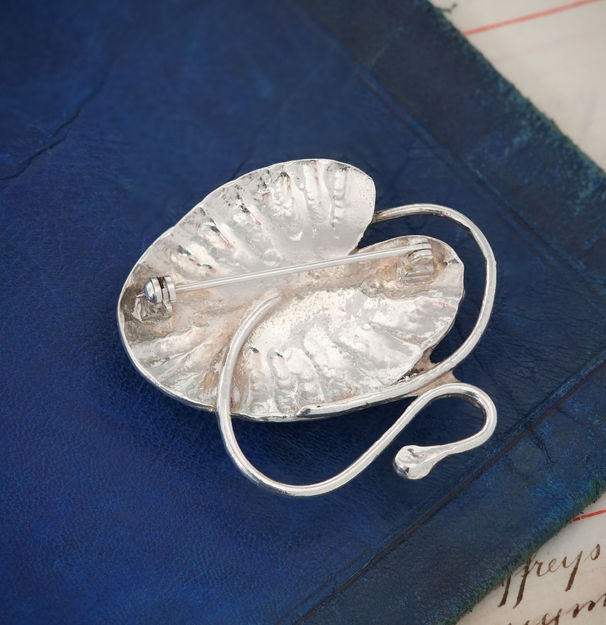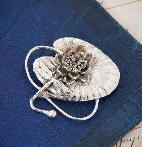 A stunning silver Art Nouveau brooch, depicting a dragonfly alighting on a lily pad with a blooming water lily – the epitome of grace and elegance. The flowing curves and shapes of this design are a tribute to the art nouveau movement, which took inspiration from the beauty of nature, and floral elements in particular. A beautiful brooch, to be worn on a lapel, on a hat or even as a large pendant.