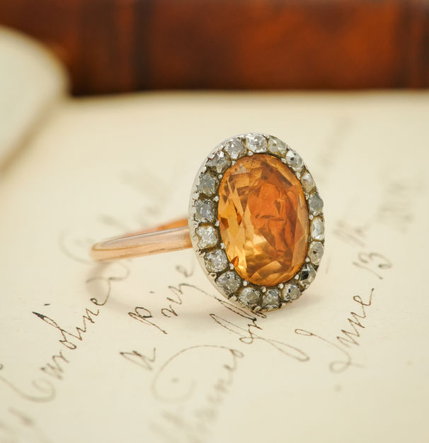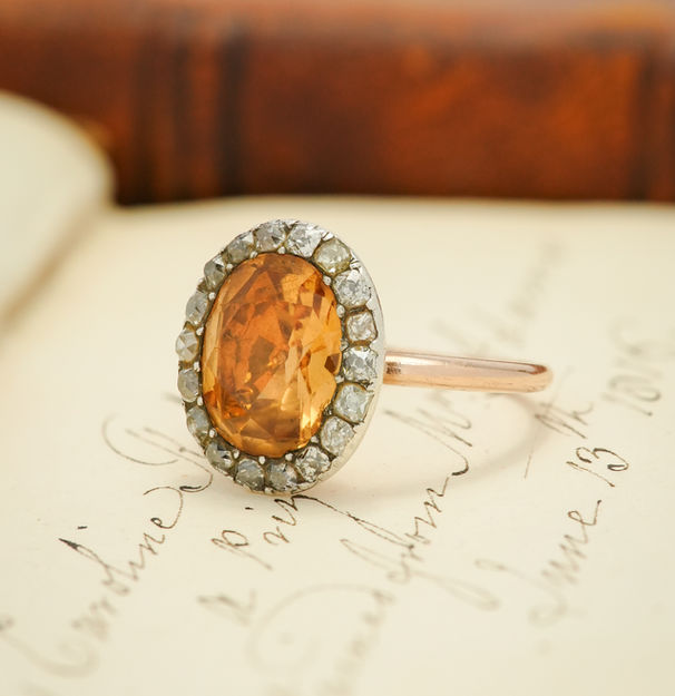 At its centre rests an oval-cut foil-backed topaz of delightful, rich colour; marmalade tinged with marigold, apricot touched by honey and ginger... its facets flicker in the light to reveal shades reminiscent of burnt sugar, autumn leaves, and golden syrup as it catches the sun. The stone is framed by a delicate halo of old-cut diamonds, their soft, silvery sparkle forming a luminous border that heightens the richness of the central gem.