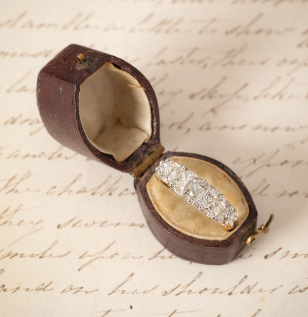 The scrolled under-gallery adds another delightful historic design element, ornamental and elegant on the finger. Finished with a classic D-profile shank, the ring sits comfortably on the hand; a timeless expression of beauty from an era of true elegance. The five-stone ring design was a favourite among Victorians, sometimes used as an engagement ring or a token of love, with each stone representative of qualities of a lasting relationship; love, trust, commitment, communication and empathy. It retained its popularity into the Edwardian era, and still today is regarded as a timeless, fashionable design.