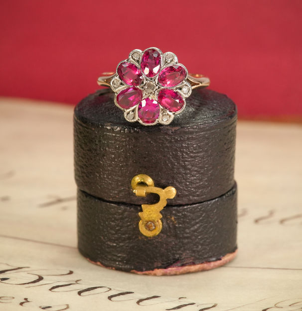 A blossoming heirloom of radiant warmth, this early 20th-century cluster ring gathers its garnets like the petals of a rare seasonal flower, each stone glowing with a pink, rosy fire. Set into 9ct gold, the gems form a lusious halo around a central sparkle, where a delicate diamond chip flickers like a dewdrop in early morning light. A further six diamond chips nestle between the gemstones, adding a glittering, frost-like effect.
