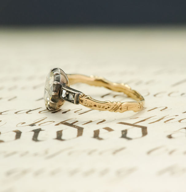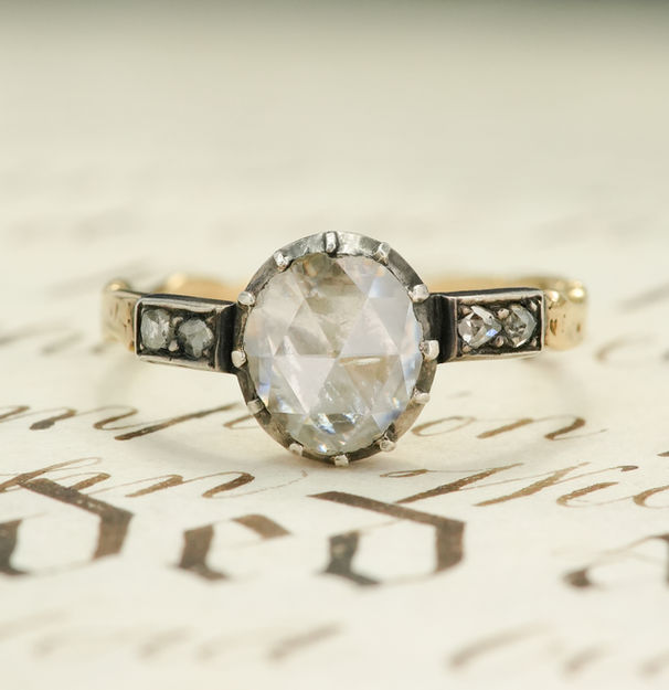 Delicate rose diamond accents glimmer along the shoulders, their antique facets echoing the central stone and adding a subtle rhythm of light along the band. The 18ct yellow gold shank provides a warm contrast to the cool silver setting, a pairing that was once the hallmark of fine historic jewellery, and the elegant scrolling band handsomely completes this delightful antique heirloom.