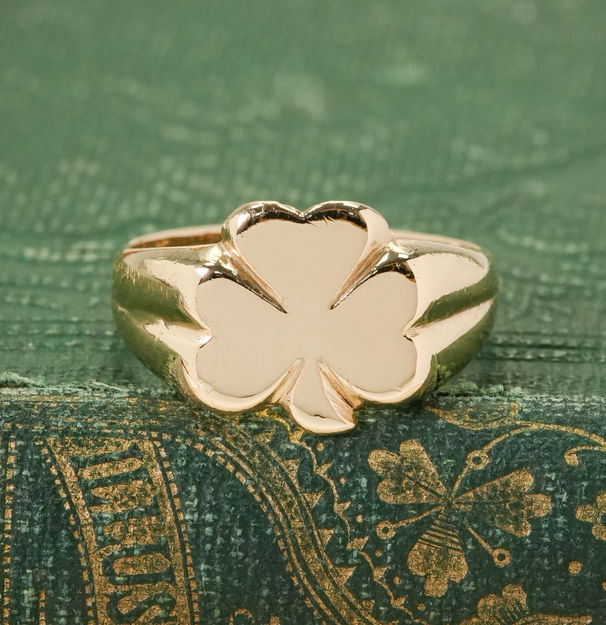 A lucky vintage 9ct gold clover signet ring. This timeless charm has long been associated with fortune and hope. Formed in warm 9ct gold, the ring’s signet face is sculpted into the gentle form of a clover, its softly rounded leaves catching the light across the warm surface of the gold. The band tapers smoothly toward the back, giving the piece a solid, satisfying weight.