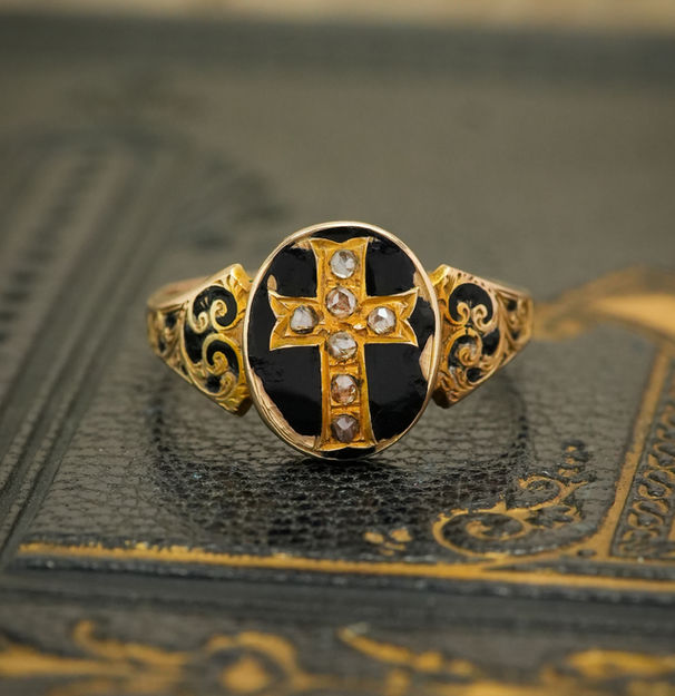 This gothic late 19th-century ring is a testament to love, memory, and the artistry of Victorian sentiment. Crafted in gold and black enamel, the oval face bears a cross set with glimmering rose-cut diamonds, their candlelit sparkle softened by the depth of the dark surround.