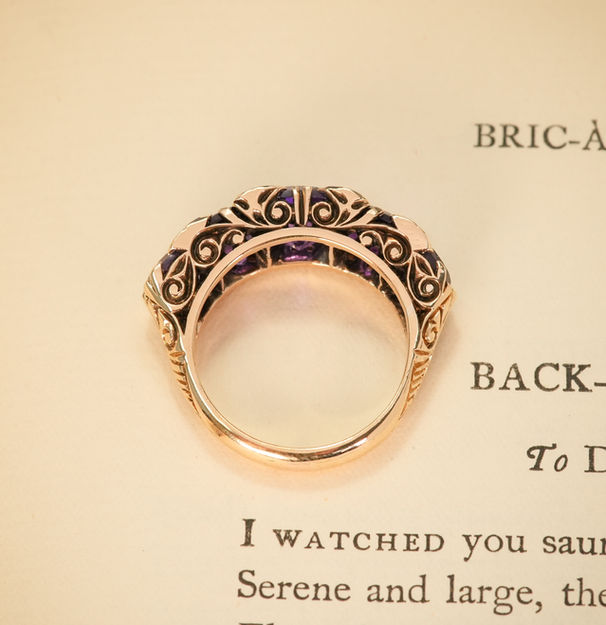 This magnificent vintage cocktail ring, designed in the Victorian manner, showcases a splendid harmony of rich amethysts and sparkling rose-cut diamonds in a bold and evocative setting. Spanning the breadth of this statement ring are five large cushion-cut amethysts, glowing with deep royal purple tones. Nestled between them are eight delicate rose-cut diamonds, each one a glimmering accent that enhances the regal radiance of the central stones.