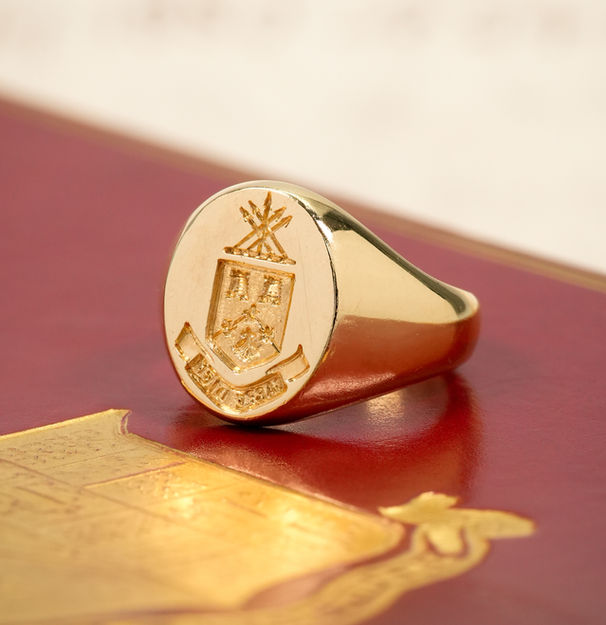 The traditional signet form speaks of identity and legacy, the turn of phrase a reminder not only of heritage, but of how one chooses to live. There is a scholarly, almost romantic air to this ring, evocative of grand old institutions, handwritten letters, and lives shaped by thought and intention.